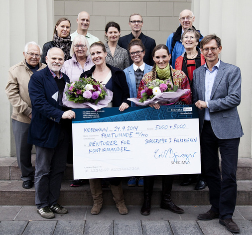 Sorggrupper i folkekirken var den ene af to prismodtagere af Kristeligt Dagblads Initiativpris 2014. Her ses de foran Københavns Domkirke. Forrest fra venstre ses Christian Juul Busch, projektleder, og Line Bjørn Hansen, styregruppeformand, der modtager prisen på vegne af folkekirkens sorggrupper. Foto: Paw Gissel.